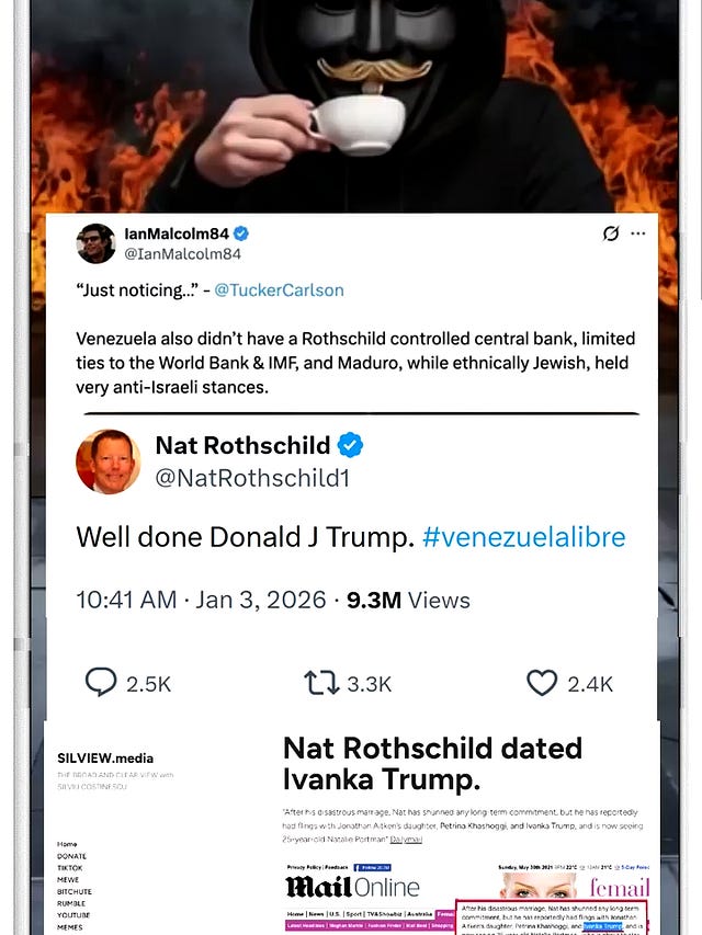 @silviewmediaJust noticing the #ROTHSCHILDS HIGH-FIVING #TRUMP for the #VENEZUELA strike. #venezuelalibre is an odd cocktail Also see "The Trump – Rothschild – Rockefeller connections" - https://silview.home.blog/2021/05/30/the-trump-rothschild-rockefeller-connections/ See more on this topic: https://SILVIEW.media Check out our original memes site: https://truth-memes.com Buy me a coffee: https://ko-fi.com/silview @mikebenzcyber @tuckercarlson @diana.i.sosoaca.official